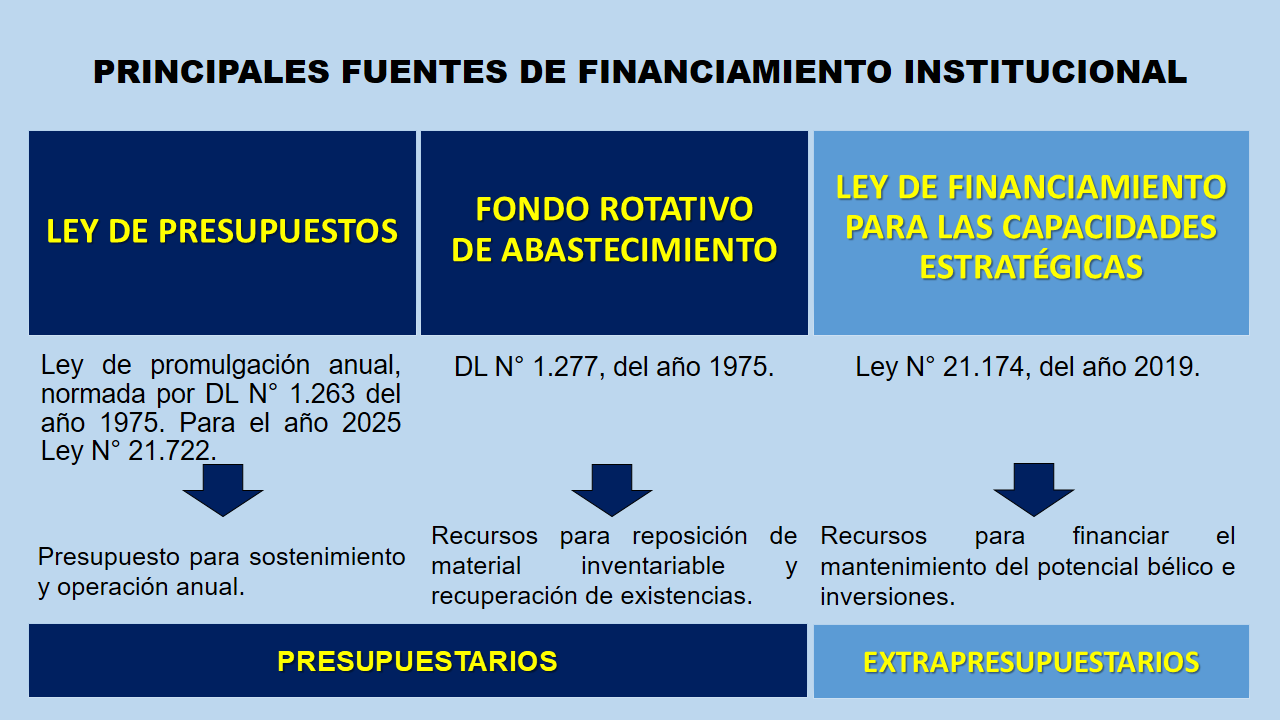 Las Fuerzas Armadas tienen como base jurídica para su financiamiento la Ley Orgánica Constitucional N°18.948 de 1990, en la cual se establece que los recursos económicos que les dan sustento estarán constituidos principalmente por los que se dispongan en la Ley de Presupuestos del Sector Público y en el Fondo de Capacidades Estratégicas, además de otros recursos provistos por leyes específicas.