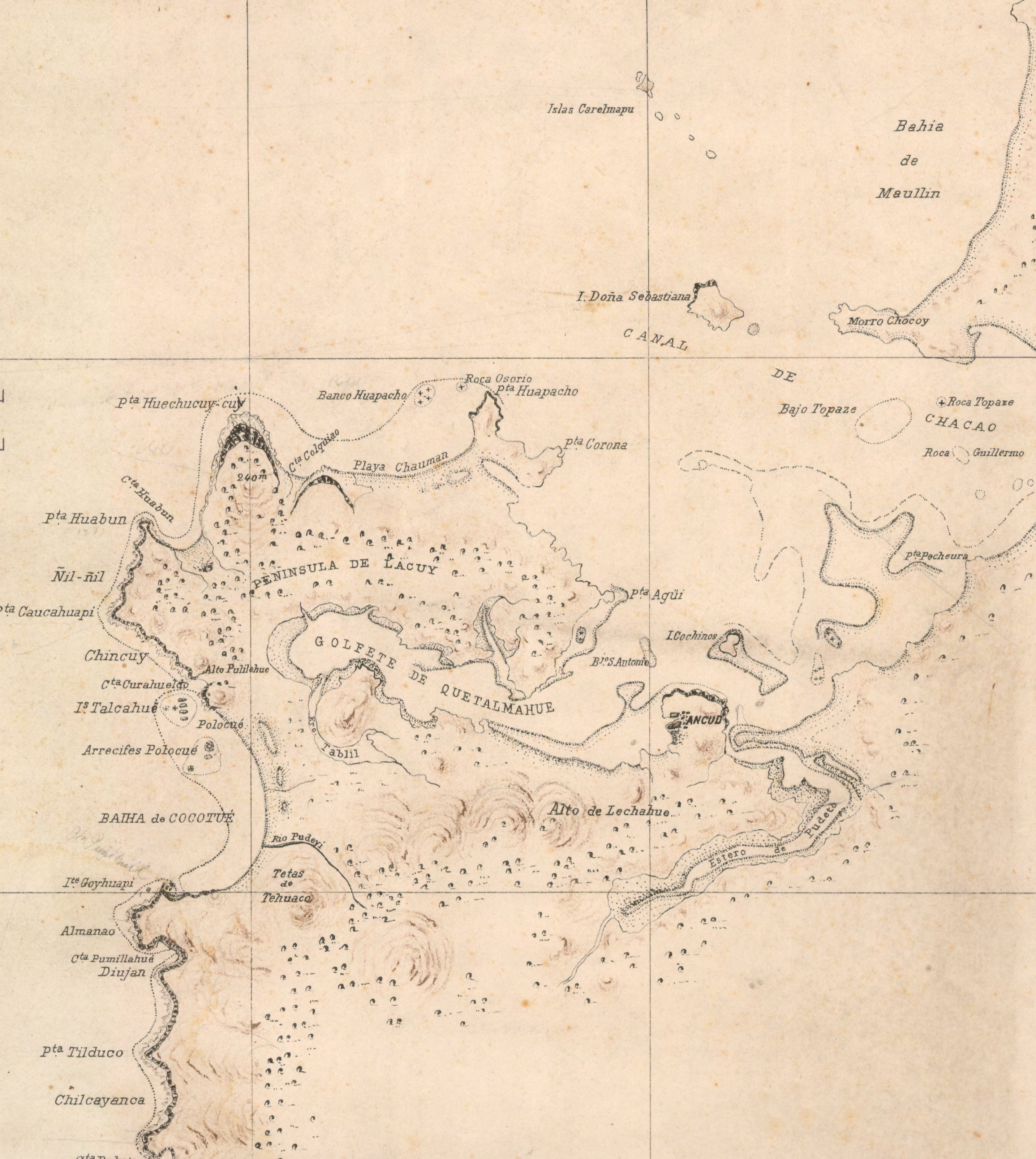 Costa occidental de la Isla Grande de Chiloé, explorada por el Capitán de corbeta Roberto Maldonado C. en 1895. (Fuente: Archivo S.H.O.A.)