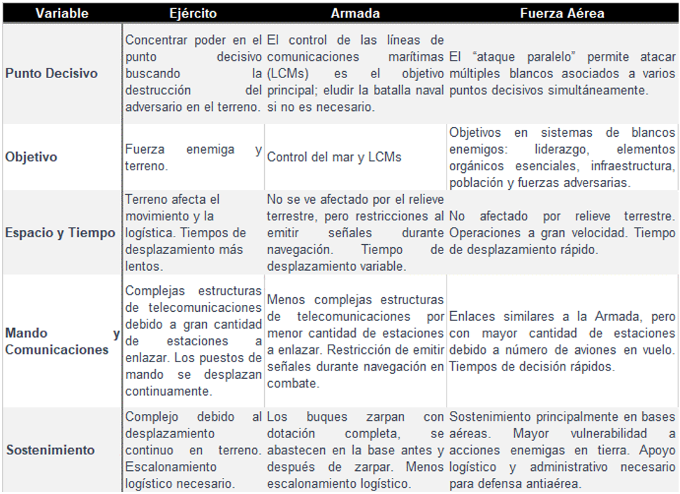 Derivado de su empleo especifico, cada institución tiene sus particularidades doctrinarias, lo que presenta dificultades para lograr el empleo de la fuerza con una visión conjunta, (Lauriani, 2022), en el cuadro que se presenta a continuación se expresan sucintamente los distintos enfoques desde cinco variables, conforme se establece el CRL Cristian Lauriani en su libro Arte Operacional. Teoría y Práctica: