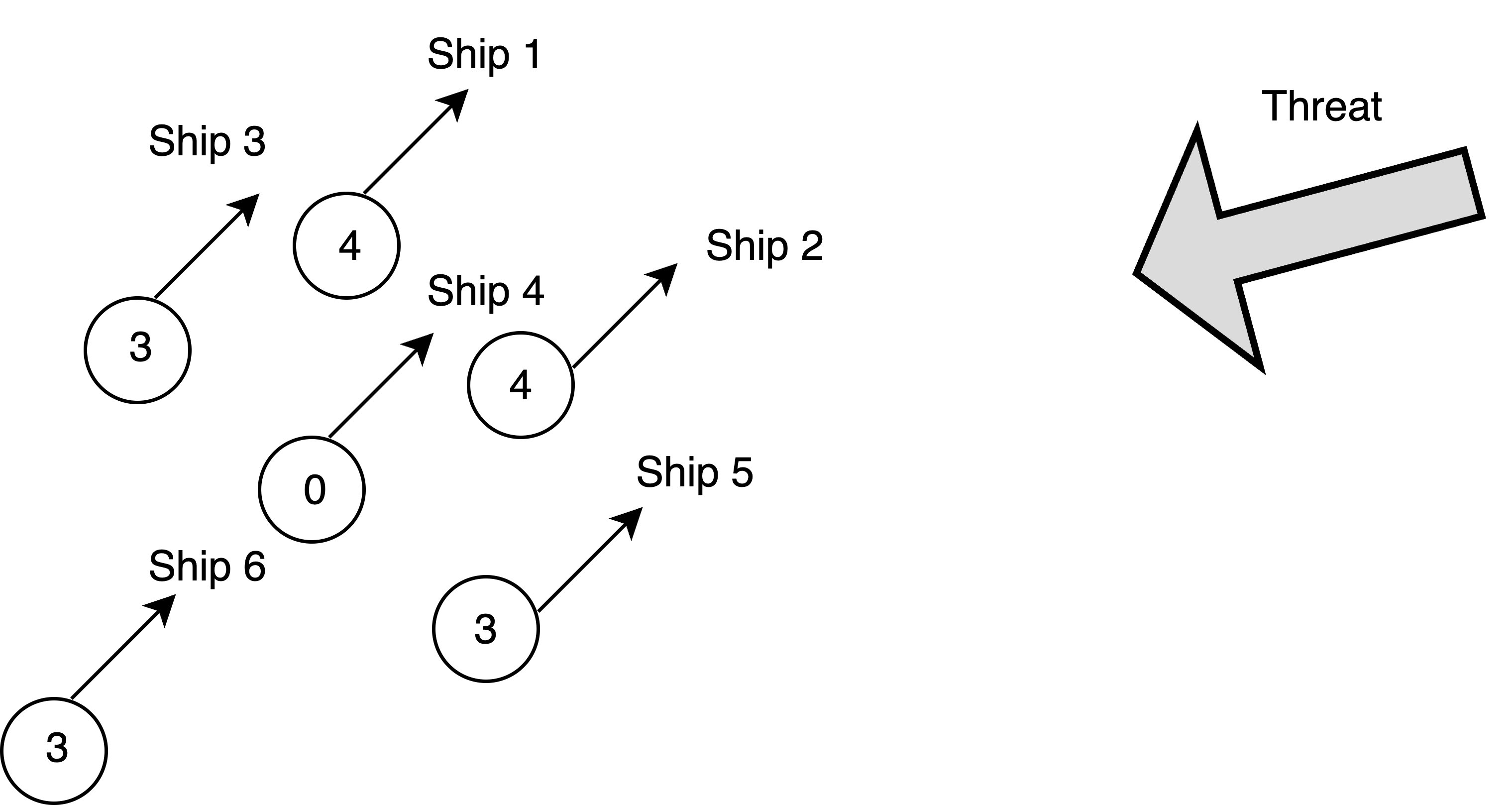 El escenario por resolver se compone de una fuerza de 6 plataformas de superficie, como se muestra en la Figura 1. Cada una contiene una determinada cantidad disponible de misiles de defensa puntual o local, detallada en el número que se encuentra en el interior del círculo.