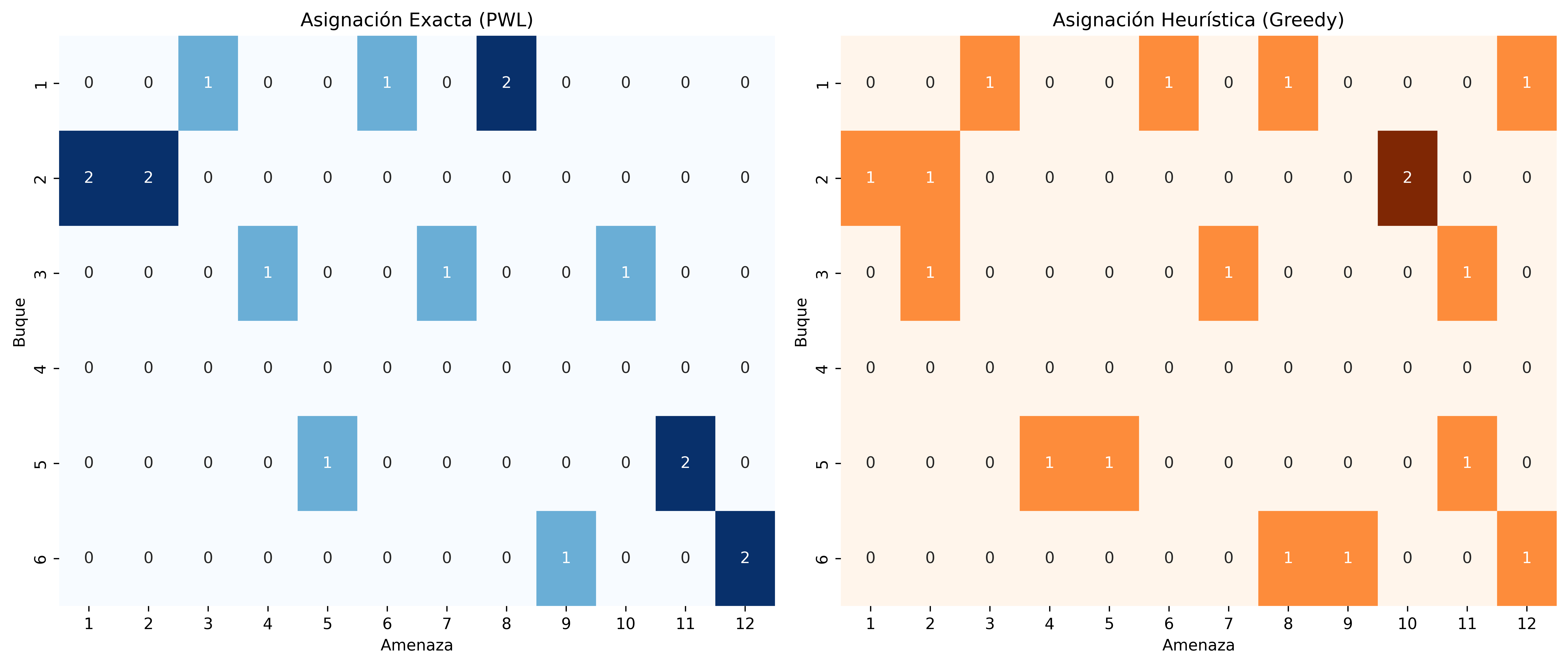 Esta Figura presenta dos mapas de calor que ilustran cómo se distribuyen las asignaciones de misiles desde cada buque (eje vertical) hacia distintas amenazas (eje horizontal). Cada celda indica cuántos misiles fueron asignados desde un buque específico a una amenaza determinada, siendo los valores más altos representados con colores más intensos. A la izquierda se muestra el resultado del modelo exacto, y a la derecha el de la heurística greedy.