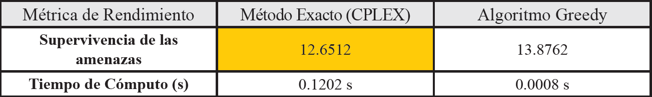 Lo expuesto en la Tabla 1 siguiente, revela el dilema central de la asignación de armas en tiempo real. Si bien el método exacto (CPLEX) ofrece una solución de un 9.7% superior en términos de minimizar la supervivencia de la amenaza (12.65 vs. 13.88), lo hace a un costo computacional 137 veces mayor (0.1202s vs. 0.0008s). Esta diferencia resulta significativa; en un escenario de combate saturado, una demora de más de 100 milisegundos para calcular una solución puede ser tácticamente inaceptable. El algoritmo Greedy, aunque subóptimo, entrega una solución de alta calidad en menos de un milisegundo, demostrando su idoneidad para sistemas que exigen una respuesta casi instantánea: