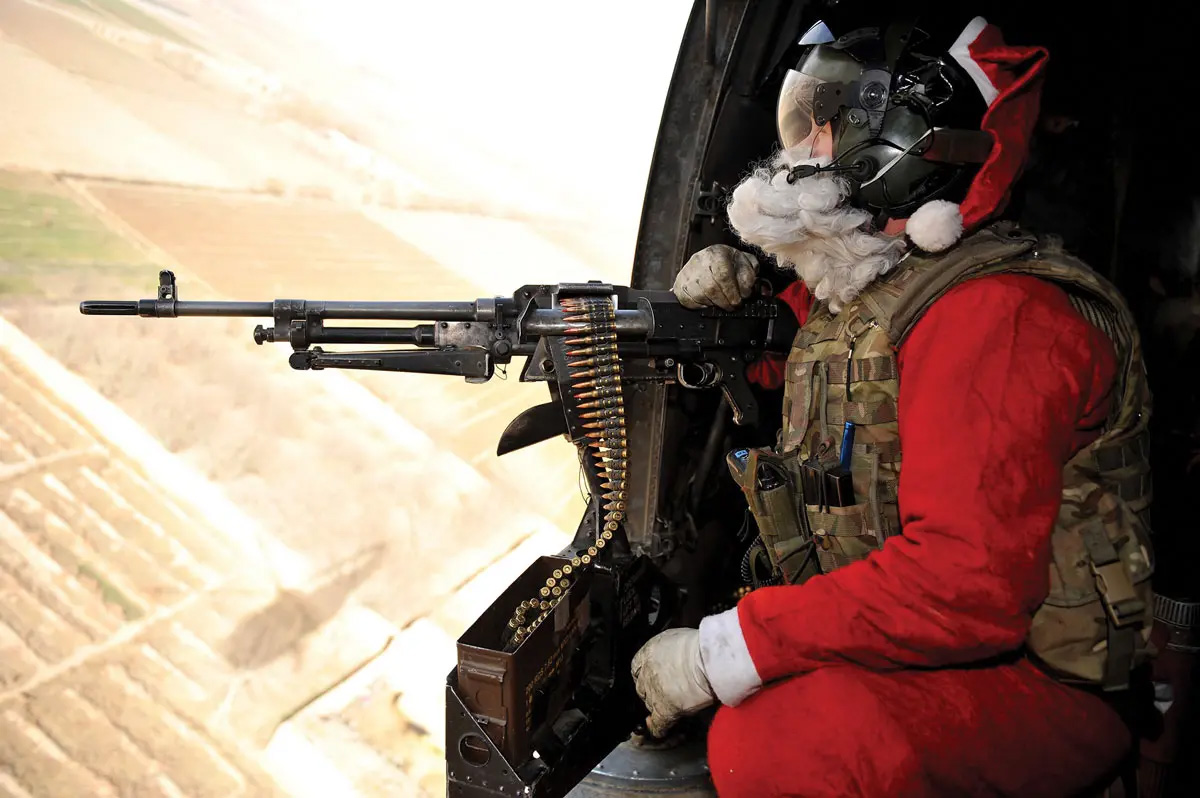 Servidor de la Marina Real Británica, vistiendo un traje de Papá Noel mientras reparte correo y regalos de Navidad a las tropas en la provincia de Helmand, Afganistán.