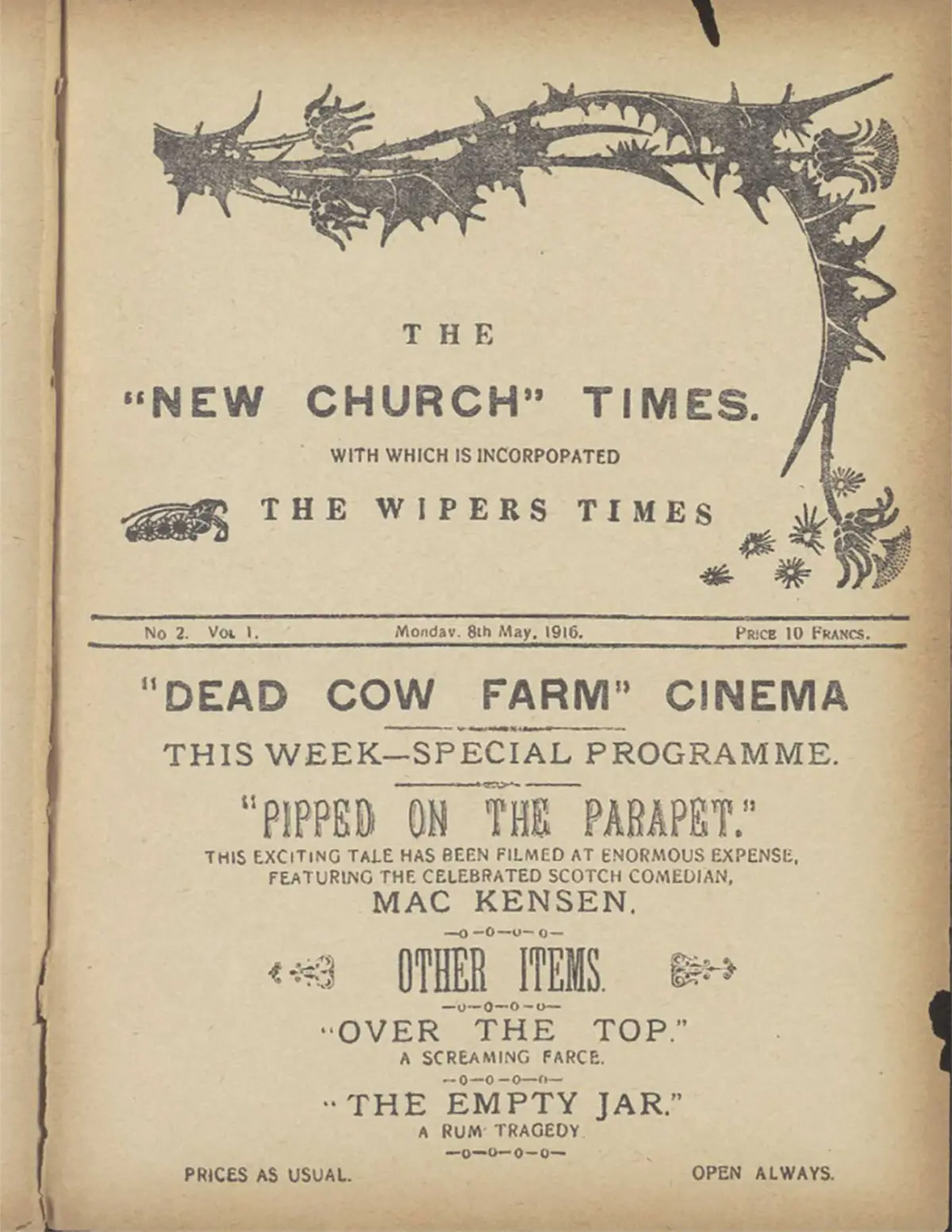 Portada del Wipers Times del 8 de mayo de 1916. La revista fue publicada por soldados británicos durante la Primera Guerra Mundial para mantener la moral.