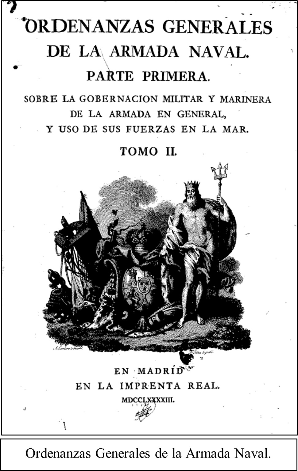 Es los primeros años de vida independiente, la Armada heredó las “Ordenanzas Generales de la Armada Naval”, promulgadas por el Rey Carlos IV en el año 1793. Este “cuerpo reglamentario estuvo vigente en su totalidad hasta 1888, año en que comenzó a ser substituido por disposiciones propias hasta adentrado el siglo XX, tiempo en el que fue eliminada la vigencia de las últimas partes que aún permanecían en vigor"2.