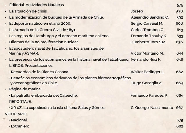 Esta edición destaca el artículo “La Armada en la Guerra Civil de 1891”, el cual, con abundantes antecedentes históricos, detalla la profunda participación de nuestra Marina en aquel doloroso enfrentamiento fratricida. Durante el conflicto, el Capitán de Navío Jorge Montt Álvarez asumió la presidencia de la Junta de Gobierno durante las hostilidades. La fotografía, tomada en 1892, muestra al ya almirante Montt en su primer año de mandato, tras haber sido elegido presidente de la República por voto popular al término de la guerra.