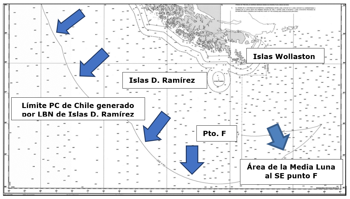 La PC de Chile, por derecho propio, se proyecta desde Islas Diego Ramírez y Wollaston hacia el SW, S y especialmente al SE el punto “F” del TPA, tal como se visualiza en el mapa a continuación; área donde Argentina el año 2023 presentó su requerimiento de PCE en su Mapa de los Espacios Marítimos: